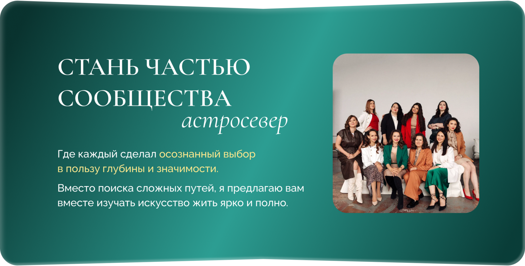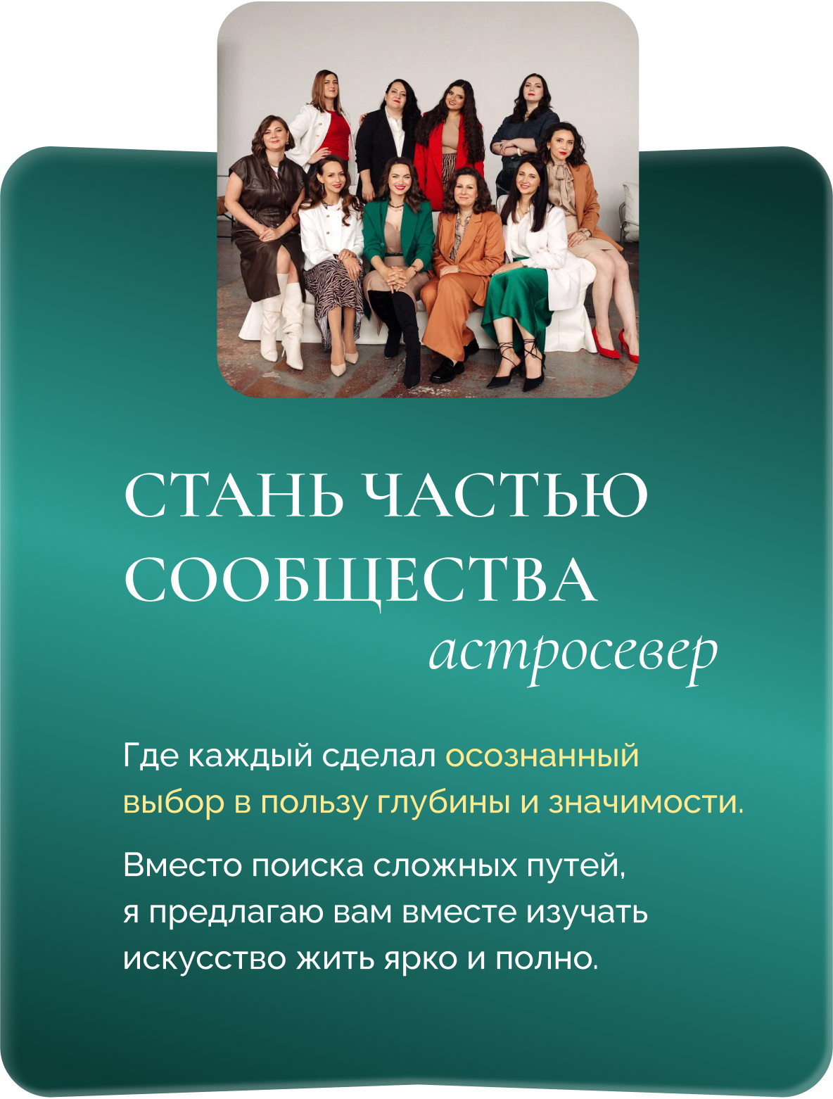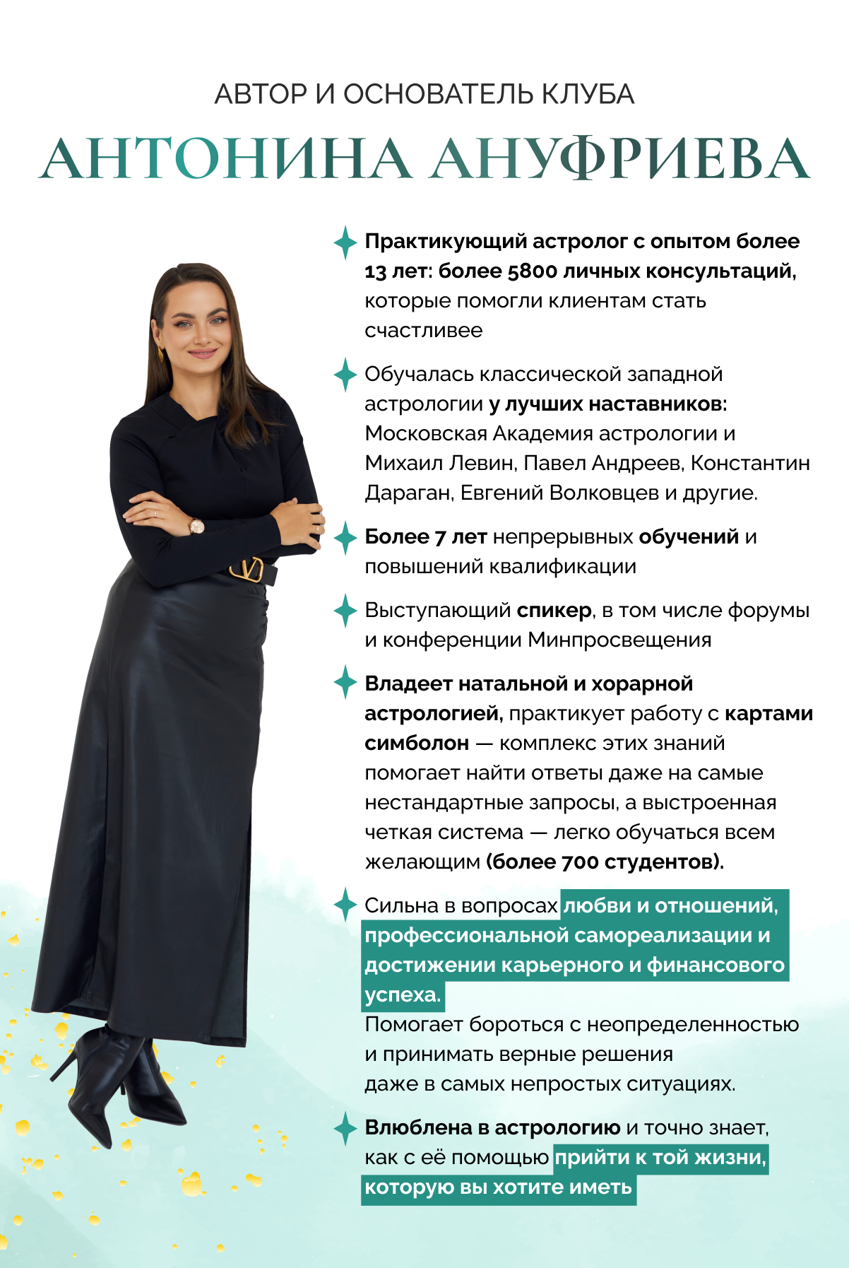 Я создала этот проект, чтобы каждый из вас смог почувствовать себя уверенно, заглянуть не только в будущее, но и вглубь себя. Клуб АстроСевер — это пространство, где вы найдете поддержку и научитесь понимать влияние звёзд на свою жизнь. Откроете ответы на волнующие вопросы, освободитесь от тревог и обретете ясность и внутренний баланс.